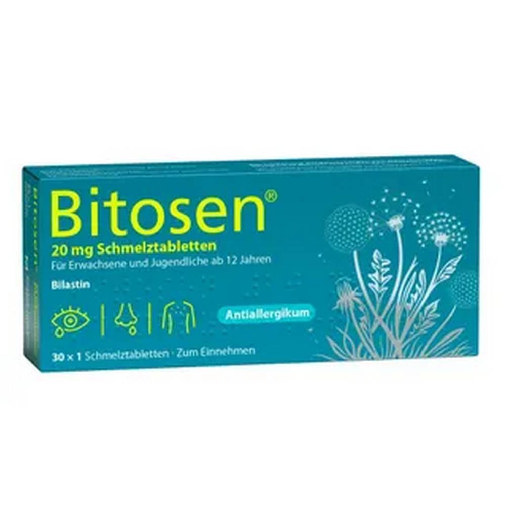 Битосен ® 20 мг таблетки для рассасывания во рту. Действующее вещество: биластин.Показания: Для взрослых и подростков в возрасте от 12 лет и старше для облегчения симптомов сенной лихорадки, других форм аллергического ринита и зуда кожи сыпь.Предупреждение: Содержит этанол. Прочитайте инструкцию. Информацию о рисках и побочных эффектах можно найти на вкладыше в упаковке и узнать у лечащего врача или фармацевта. Фармацевтическая компания:Menarini International Operations Luxembourg SA, совместно сBERLIN-CHEMIE AG, 12489 Berlin.