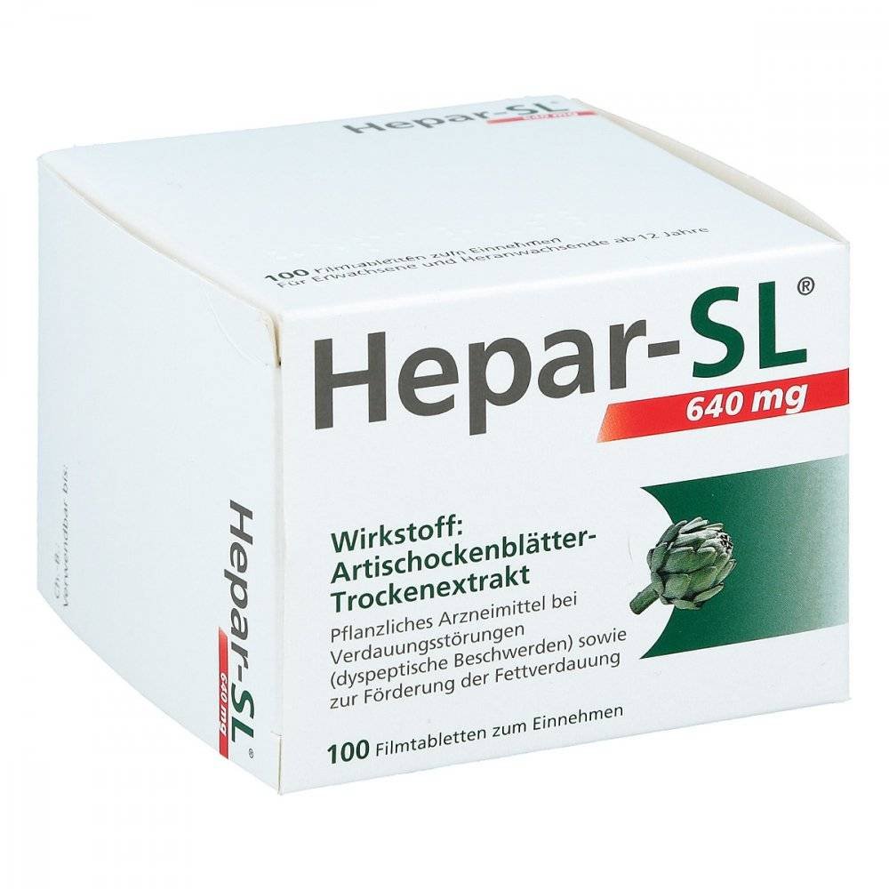 Hepar-sl 640 mg Filmtabletten (Packungsgröße: 100 stk) hilft Verdauungsbeschwerden wie schmerzhaftem Magendrücken, unangenehmem Völlegefühl und Blähungen vorzubeugen. Hepar-sl 640 mg Filmtabletten (Packungsgröße: 100 stk) wird direkt beim Essen eingenommen und beugt so den Beschwerden effektiv vor. Der natürliche Extrakt aktiviert das körpereigene Verdauungssystem und verbessert den Abbau von Nahrung und Nahrungsfetten.