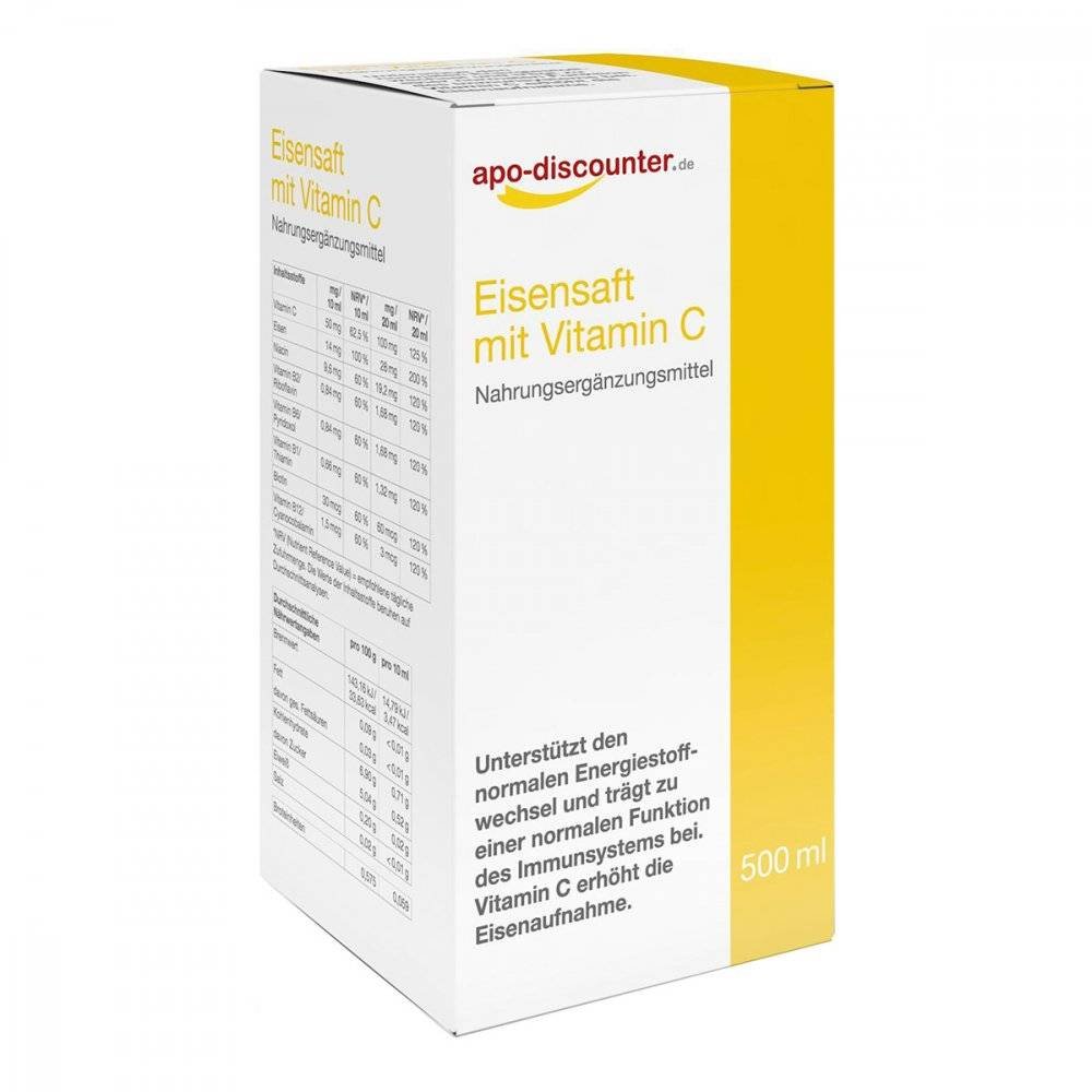 Eisensaft mit Vitamin C von apo-discounter (Packungsgröße: 500 ml) ist ein Nahrungsergänzungsmittel mit Eisen und Vitamin C.